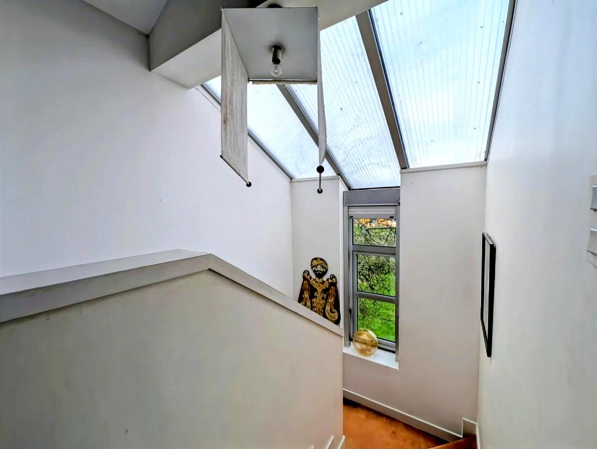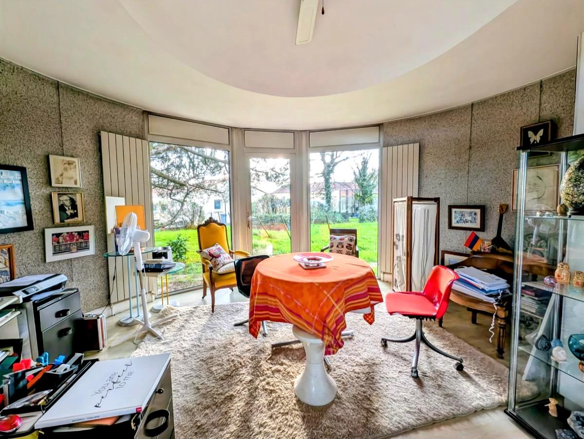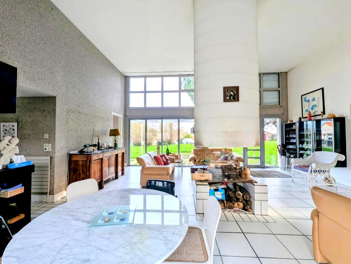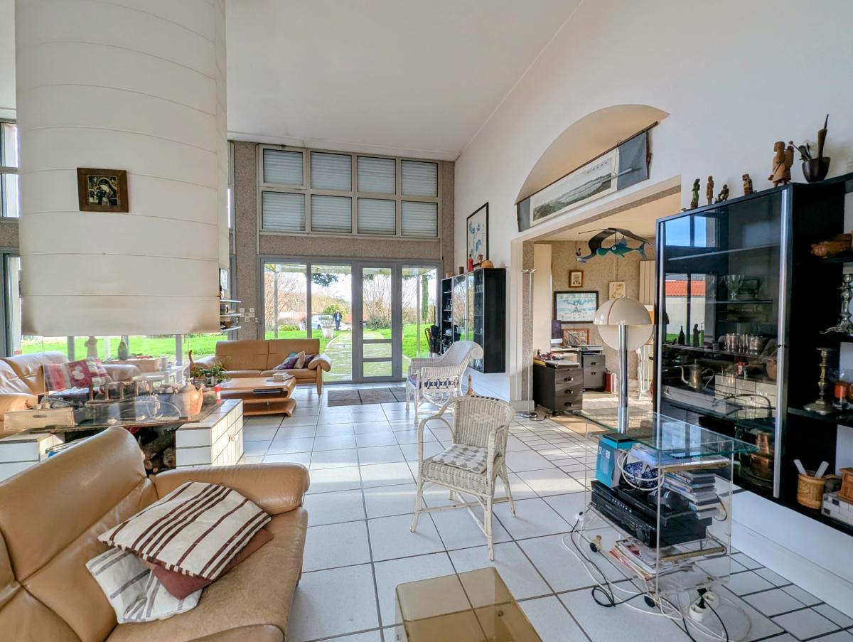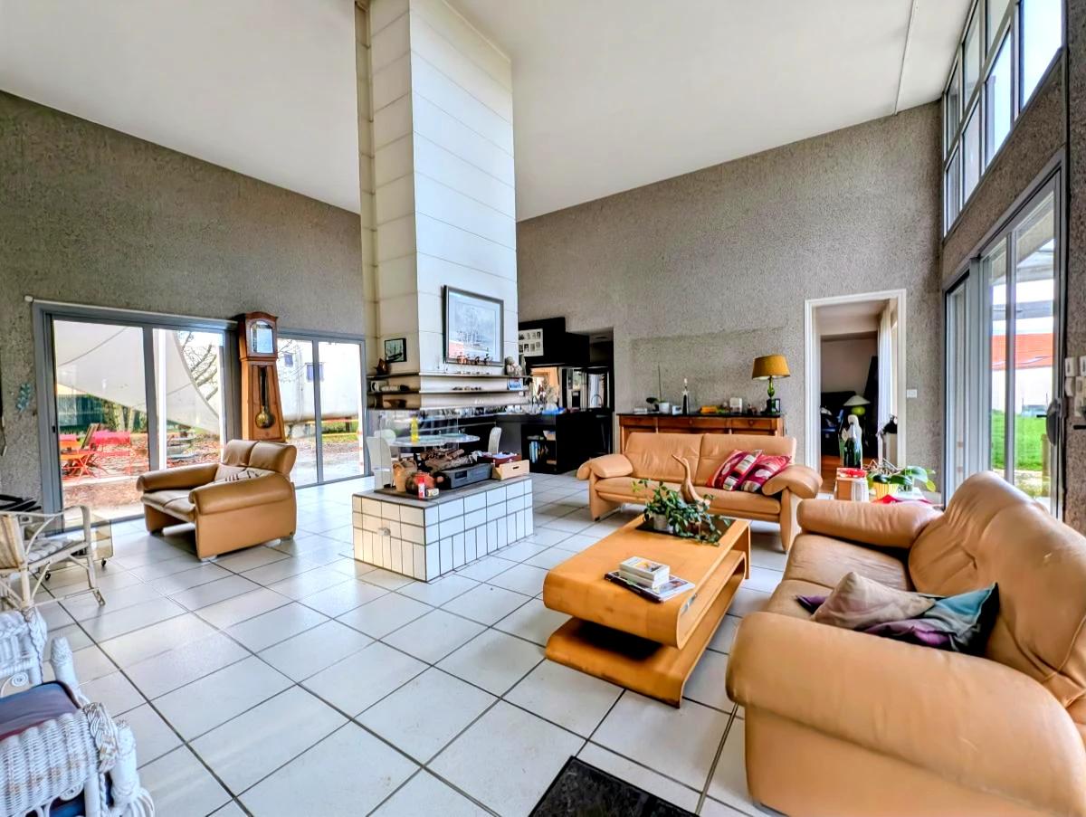 Proche du centre de PORT SAINT PERE, une maison d'architecte de 1988 sur étage d'environ 170m² sur un terrain de 2241m² (avec chemin indivis de 1313m² en plus), comprenant :